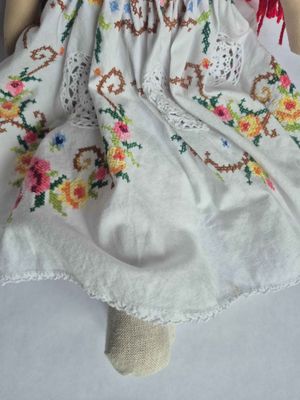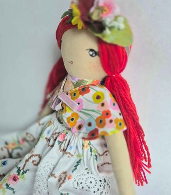 With her long red hair and delicately, embroidered vintage skirt, she carries the gentle charm of a doll who looks as though she might full of life and fun! She wears a handmade cotton vintage circle skirt, cotton caplet and legwarmers, carefully chosen from beautiful new and vintage fabrics.
