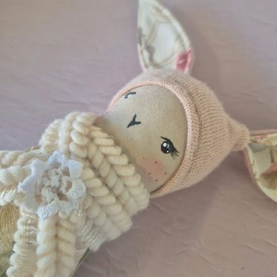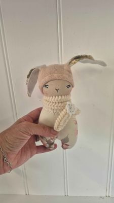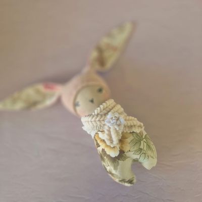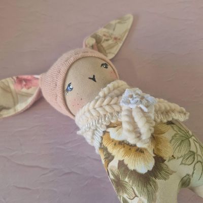My Mini Bunny Dolls are a sweet, smaller take on my much-loved bunny designs — measuring approximately 18cm tall (without ears) and full of gentle character. Each one is lovingly handcrafted from a thoughtful blend of new and vintage fabrics, chosen for their softness, texture, and timeless charm.